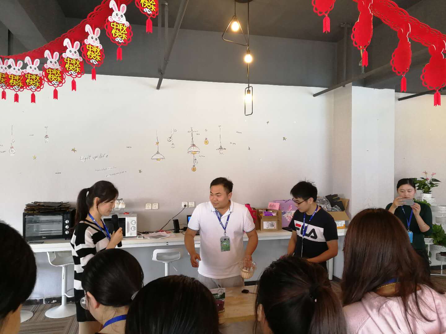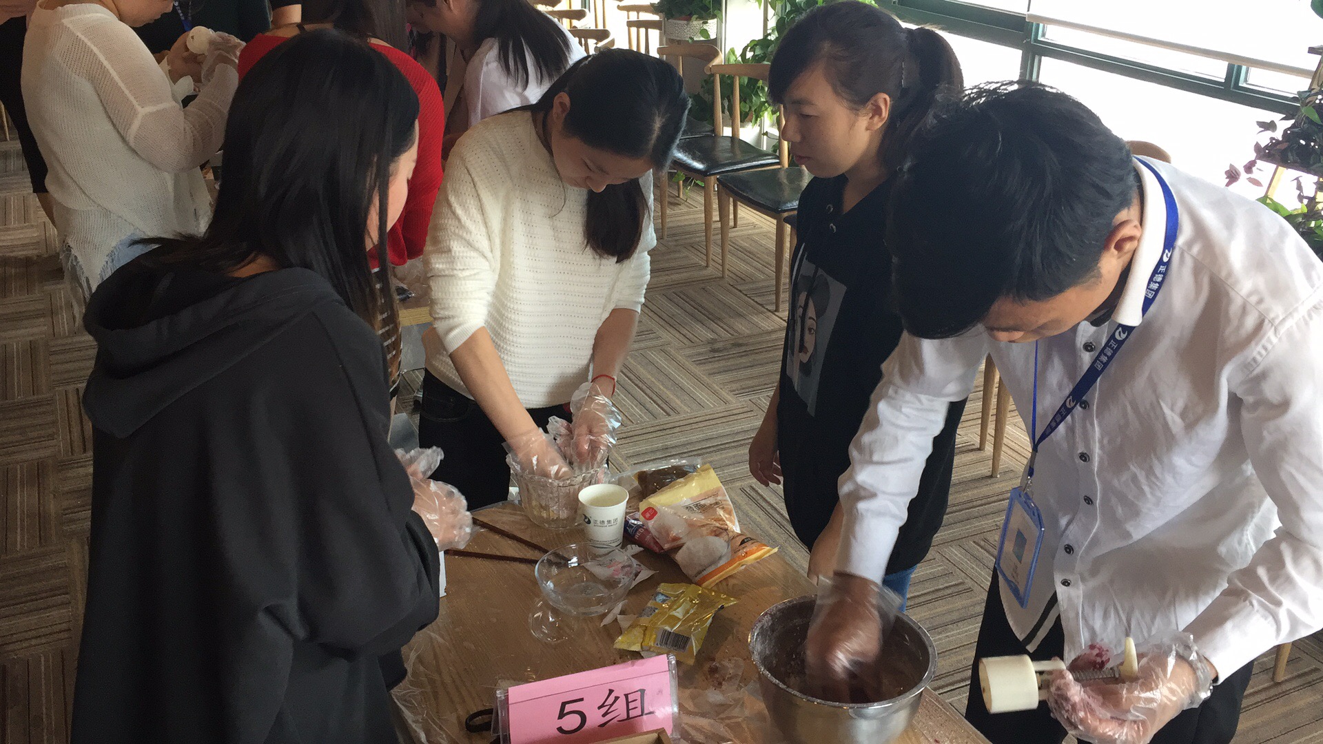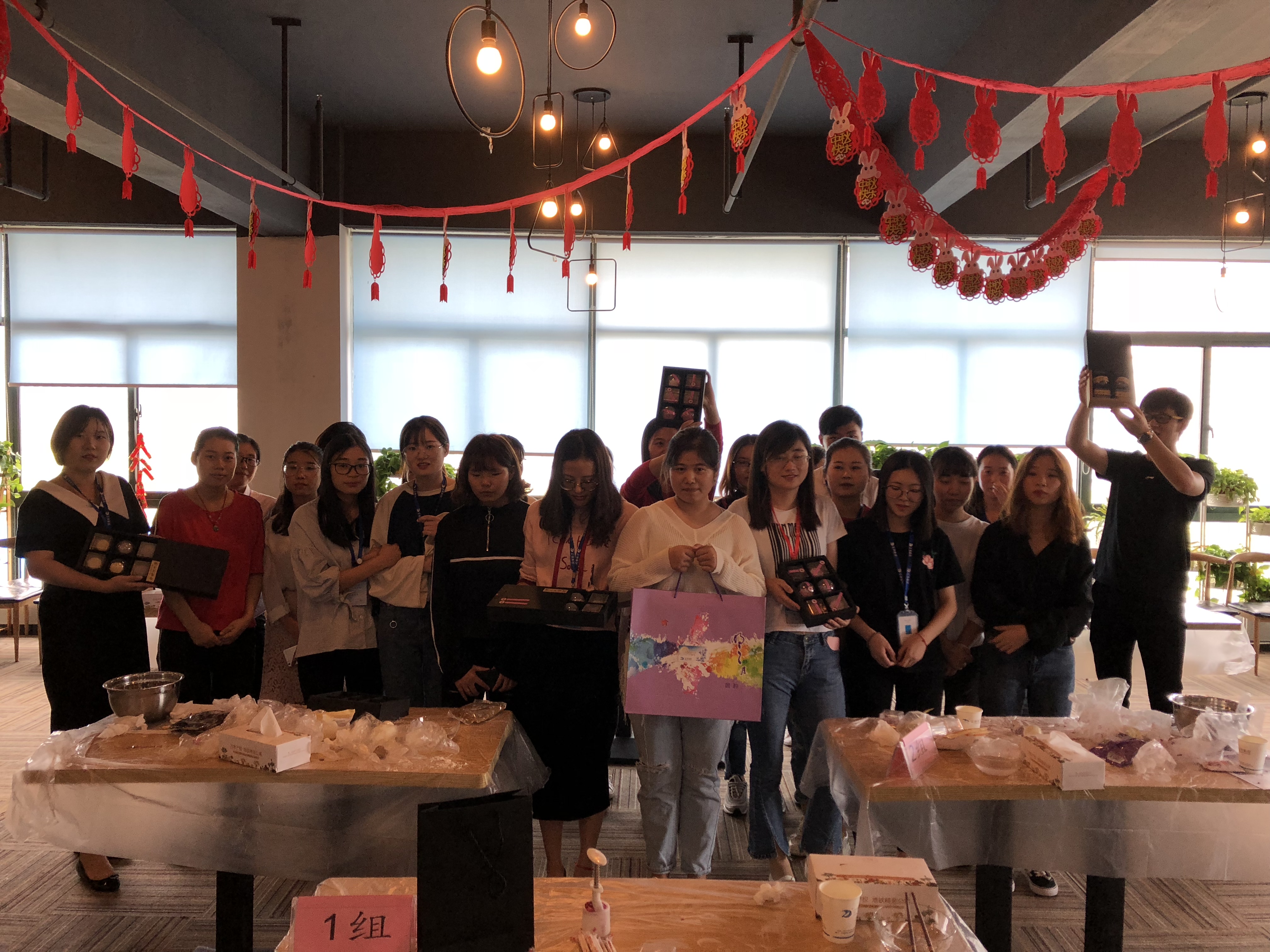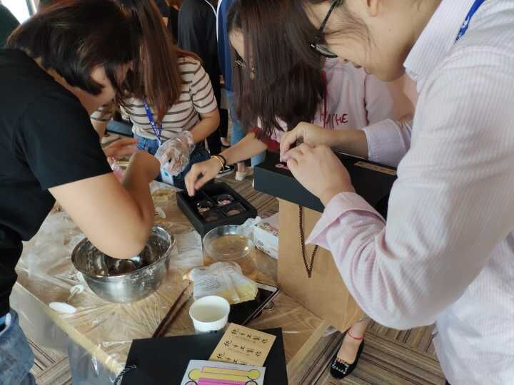 终于到了寿星们亲自动手的时刻了!大家兵分两路,一部分负责制作月饼,一部分负责制作礼盒。这边搅拌,那边折叠,配合的很默契啊!
