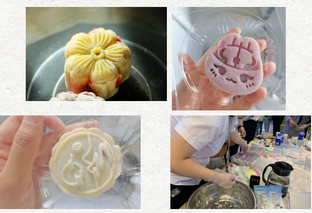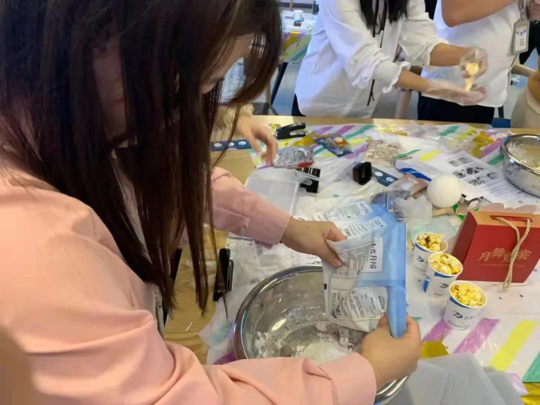 很快大家就掌握了其中要领,从制作冰皮,到包馅,最后压入模具,印上各式花色,逐渐的得心应手了起来。