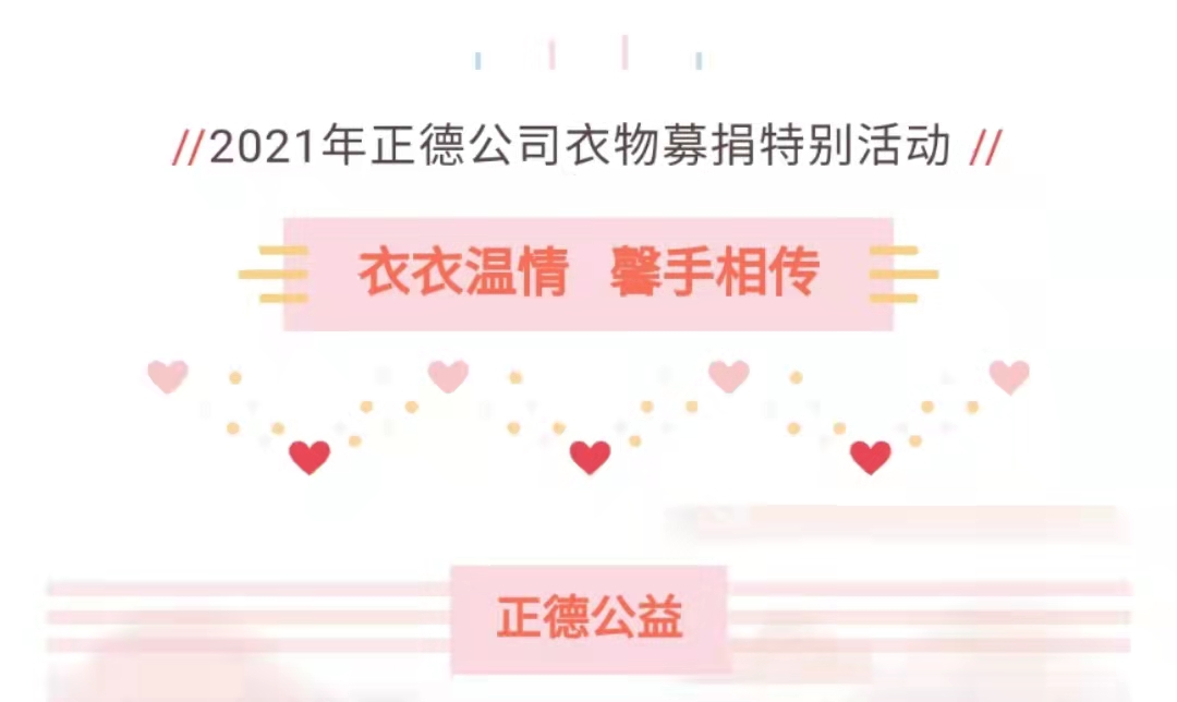 此次衣物募捐活动旨在鼓励员工献出一份爱心,体现自身价值,激发员工的勤俭意识;同时在公司内部积极宣扬绿色环保精神,弘扬中华民族无私奉献的优良传统,让正德创造更多的社会效益。