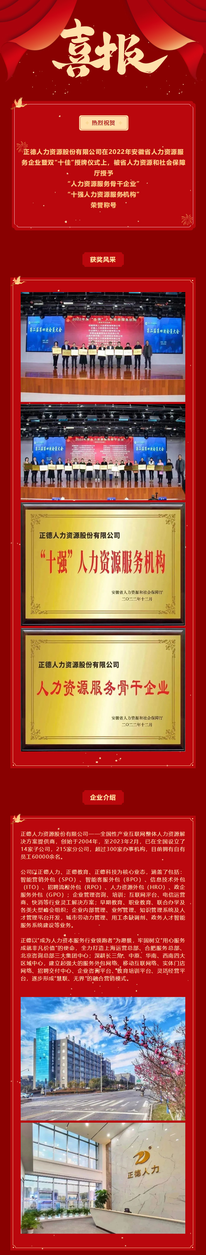 喜报!热烈祝贺正德人力荣获“人力资源服务骨干企业”、“十强人力资源服务机构”荣誉称号