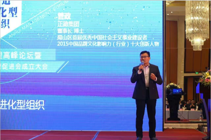 正德集团董事长管政博士率先走上讲台,为到场嘉宾带来“打造进化型组织”主题演讲,管政博士认为“互联网时代,一些企业借助互联网获得短期发展,很多企业在盲目跟风,新的形势下,企业能够活过来就已经很了不起了,一个百年的事业在于一个企业的内部,练好“内功“,加强企业内部组织建设。并通过举联想和恒大两个案例说明企业应该找到自己的专业领域,寻找价值定位和创新突破。